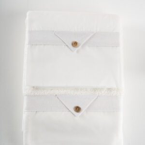 Λαδόπανα βάπτισης Νόρα | Nora από την εταιρία Lina Baby Βαμβακερό σετ λαδόπανου σε τρία χρώματα λευκό, ιβουαρ και εκρου- σάπιο μήλο, με διακοσμητική τρέσα broderies anglais λευκό, εκρού ή σαπιο μήλο αντίστοιχα και χειροποίητο λουλούδι από ύφασμα με φτερά. Το σετ περιλαμβάνει, πετσέτα μεγάλη, λαδόπανο, μικρή πετσέτα και εσώρουχα. • Πετσέτα 100% βαμβακερή διαστάσεων 90*140*450g. OEKO-TEX STANDARD 100 • Πετσέτα παπά 100% βαμβακερή διαστάσεων ραμμένη 30×50 Υπάρχει η δυνατότητα γραφής του ονόματος του παιδιού με κέντημα, ίδιων αποχρώσεων με το λαδόπανο με έξτρα χρέωση. Με κέντημα ενός ονόματος +20ευρώ. Με κέντημα δύο ονομάτων +30ευρω.