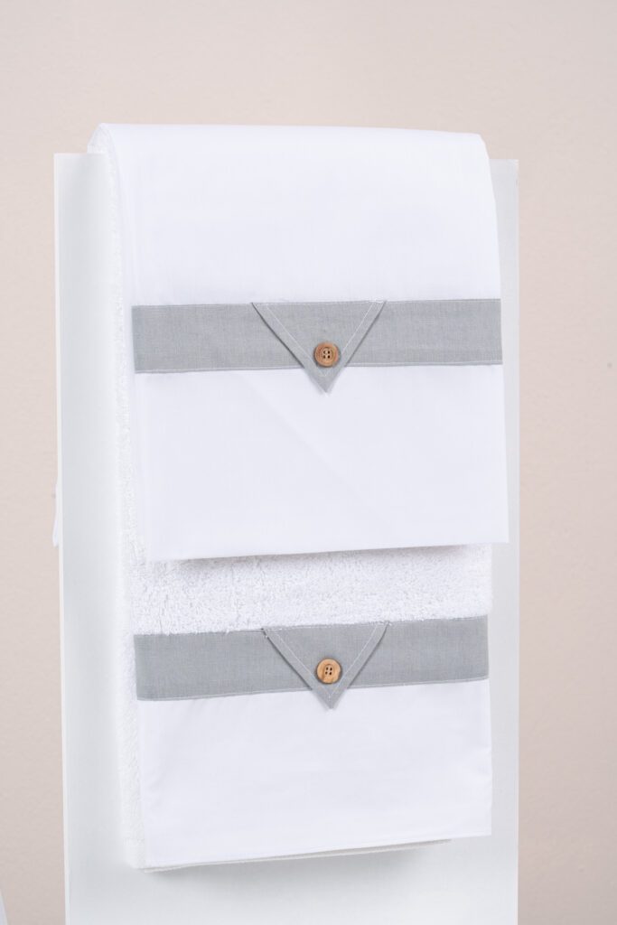 Λαδόπανα βάπτισης Simple Boy από την εταιρία Lina Baby Simple & Chic , oτι πιο απλό για αυτό το Βαμβακερό σετ  λαδόπανο σε λευκό και ιβουάρ χρώμα με διακοσμητική «τρυπητή» τρέσα  και φιογκάκι από βαμβακερή ποντικοουρά με λευκές χάντρες.  Το σετ περιλαμβάνει, πετσέτα μεγάλη, λαδόπανο, μικρή πετσέτα και εσώρουχα. • Πετσέτα 100% βαμβακερή διαστάσεων 90*140*450g. OEKO-TEX STANDARD 100 • Πετσέτα παπά 100% βαμβακερή διαστάσεων ραμμένη 30×50 Υπάρχει η δυνατότητα γραφής του ονόματος του παιδιού με κέντημα, ίδιων αποχρώσεων με το λαδόπανο με έξτρα χρέωση. Με κέντημα ενός ονόματος +20ευρώ. Με κέντημα δύο ονομάτων +30ευρω.