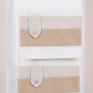 Για τους λάτρεις των Παστέλ αποχρώσεων αυτό το σετ λαδόπανων είναι το καταλλήλότερο. Σε λευκή Βαμβακερή απόχρωση διακοσμημένο απο τρέσες χρωμάτος μπεζ και σιέλ μελανζέ. Ολες οι πετσέτες της Lina Baby φέρουν την ετικέτα STANDARD 100 by OEKO-TEX® (Αυτό σημαίνει ότι τα προϊόντα δεν περιέχουν επιβλαβή επίπεδα χημικών ουσιών.)       Το σετ περιλαμβάνει, πετσέτα μεγάλη, λαδόπανο, μικρή πετσέτα και εσώρουχα. • Πετσέτα 100% βαμβακερή διαστάσεων 70*140*400g. OEKO-TEX STANDARD 100 • Πετσέτα παπά 100% βαμβακερή διαστάσεων ραμμένη 30×50 Υπάρχει η δυνατότητα γραφής του ονόματος του παιδιού με κέντημα, ίδιων αποχρώσεων με το λαδόπανο με έξτρα χρέωση. Με κέντημα ενός ονόματος +20ευρώ. Με κέντημα δύο ονομάτων +30ευρω.