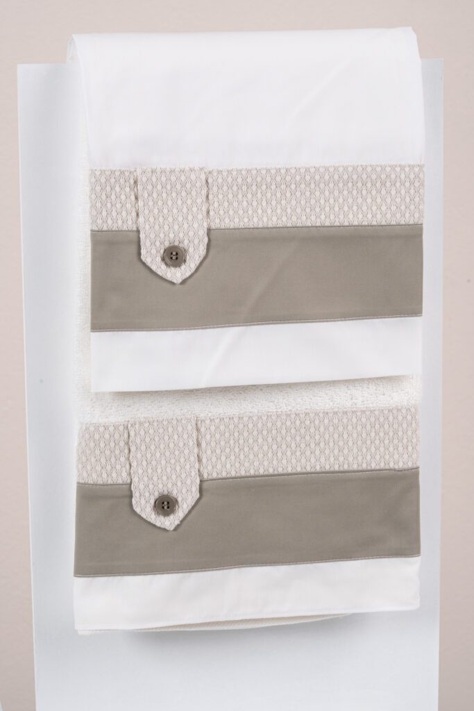 Λαδόπανα βάπτισης Ιθάκη | Ithaca από την εταιρία Lina Baby Απλό και κομψό βαμβακερό σετ  λαδόπανων σε λευκό χρώμα με δαντέλα τύπου βελονάκι, ντεγκραντέ τρέσα σε χρωματισμούς του απαλου Γκρί, Ιβουάρ  και Λευκού. Στην μέση της δαντέλας ενα διακριτικό  φιογκάκι περασμένο σε λευκή χάντρα. Το σετ περιλαμβάνει, πετσέτα μεγάλη, λαδόπανο, μικρή πετσέτα και εσώρουχα. • Πετσέτα 100% βαμβακερή διαστάσεων 90*140*450g. OEKO-TEX STANDARD 100 • Πετσέτα παπά 100% βαμβακερή διαστάσεων ραμμένη 30×50 Υπάρχει η δυνατότητα γραφής του ονόματος του παιδιού με κέντημα, ίδιων αποχρώσεων με το λαδόπανο με έξτρα χρέωση. Με κέντημα ενός ονόματος +20ευρώ. Με κέντημα δύο ονομάτων +30ευρω.