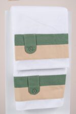 Λαδόπανα βάπτισης Ιάσονας | Jason από την εταιρία Lina Baby Βαμβακερό σετ  λαδόπανων σε λευκό χρώμα  με ιδιαίτερη τρέσα από ζικ-ζακ κορδόνια στο χρώμα του σπάγκου και έξτρα τρέσα στο χρώμα της μέντας. Ένα φιογκάκι από την ίδια τρεσα με κουμπάκι στο ιδιο χρώμα ολοκληρωνει την διακόσμηση.   Το σετ περιλαμβάνει, πετσέτα μεγάλη, λαδόπανο, μικρή πετσέτα και εσώρουχα. • Πετσέτα 100% βαμβακερή διαστάσεων 90*140*450g. OEKO-TEX STANDARD 100 • Πετσέτα παπά 100% βαμβακερή διαστάσεων ραμμένη 30×50 Υπάρχει η δυνατότητα γραφής του ονόματος του παιδιού με κέντημα, ίδιων αποχρώσεων με το λαδόπανο με έξτρα χρέωση. Με κέντημα ενός ονόματος +20ευρώ. Με κέντημα δύο ονομάτων +30ευρω.