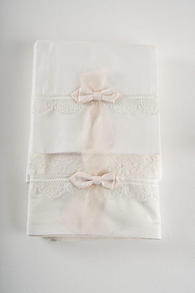 Λαδόπανα βάπτισης Δαντέλα Γαλλίας | French Lace από την εταιρία Lina Baby Βαμβακερό σετ λαδόπανου σε δύο χρώματα λευκό και ιβουάρ με εντυπωσιακή γαλλική δαντέλα και φιόγκο από οργαντίνα με στρας. Το σετ περιλαμβάνει, πετσέτα μεγάλη, λαδόπανο, μικρή πετσέτα και εσώρουχα. • Πετσέτα 100% βαμβακερή διαστάσεων 90*140*450g. OEKO-TEX STANDARD 100 • Πετσέτα παπά 100% βαμβακερή διαστάσεων ραμμένη 30×50 Υπάρχει η δυνατότητα γραφής του ονόματος του παιδιού με κέντημα, ίδιων αποχρώσεων με το λαδόπανο με έξτρα χρέωση. Με κέντημα ενός ονόματος +20ευρώ. Με κέντημα δύο ονομάτων +30ευρω.