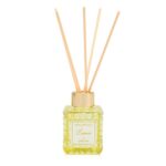 Το ανάγλυφο γυάλινο μπουκάλι σε φωτεινό κίτρινο τόνο, σε συνδυασμό με το χρυσό καπάκι, χαρίζει μια χαρούμενη και κομψή αισθητική που ξεχωρίζει στον χώρο.
