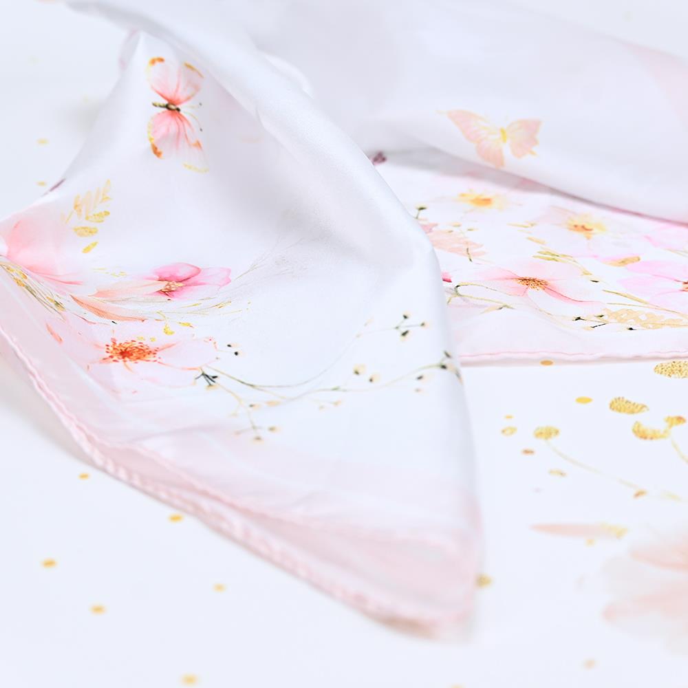 Ένα ιδιαίτερο charm με μαντιλάκι σε ρομαντικό ροζ μοτίβο, διακοσμημένο με πέρλες και μεταλλικό λουλουδάκι, σχεδιασμένο για να δίνει ξεχωριστό χαρακτήρα σε κάθε εμφάνιση.